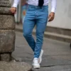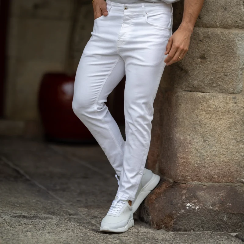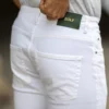 Presilhas para o cinto. Fecho frontal com fecho de correr oculto por carcela e botão.