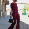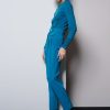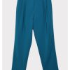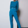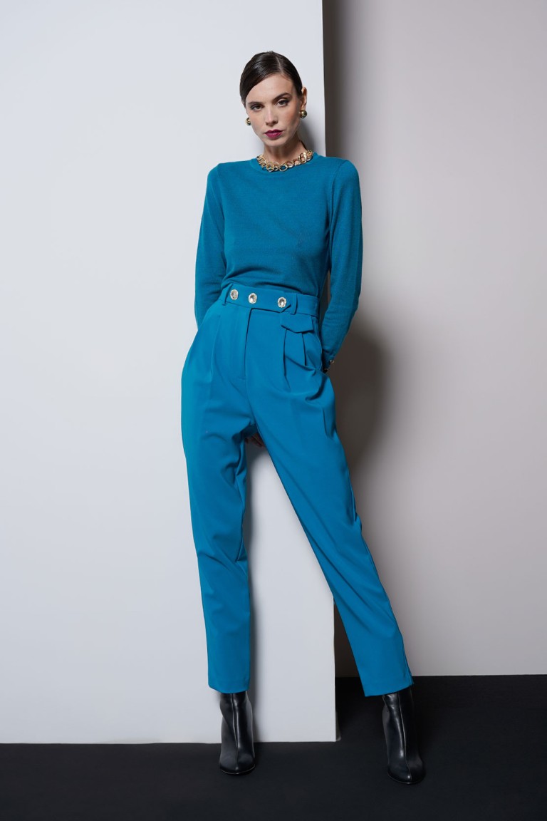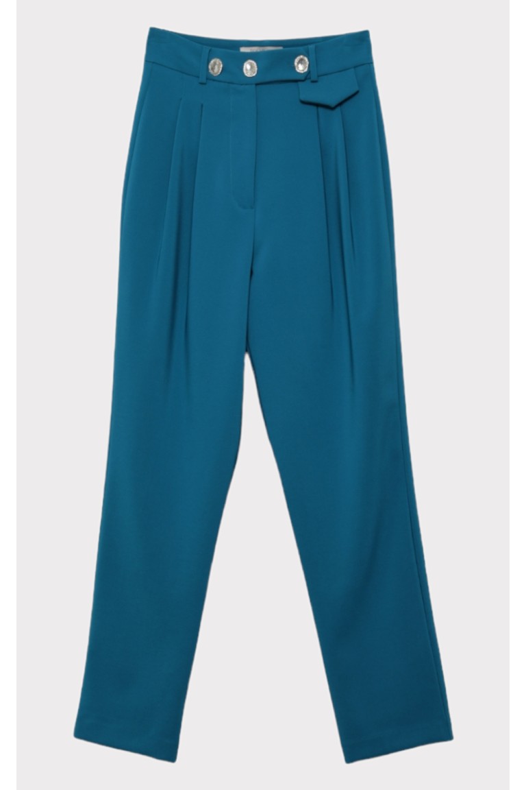 Calças de cintura alta. Bustier com aba lateral e detalhe de botão de joia. Pences. Fecho frontal com zíper invisível.