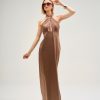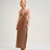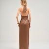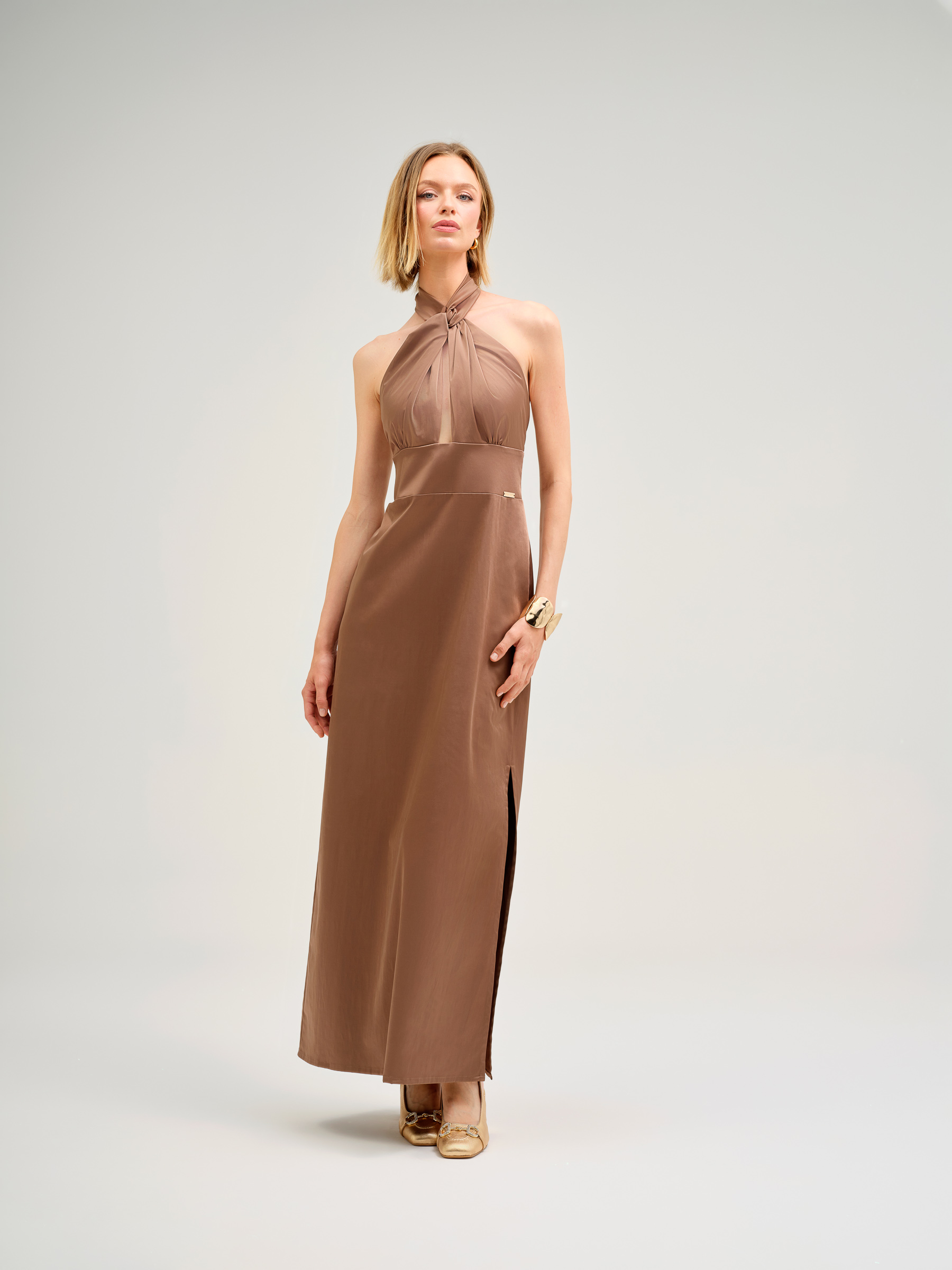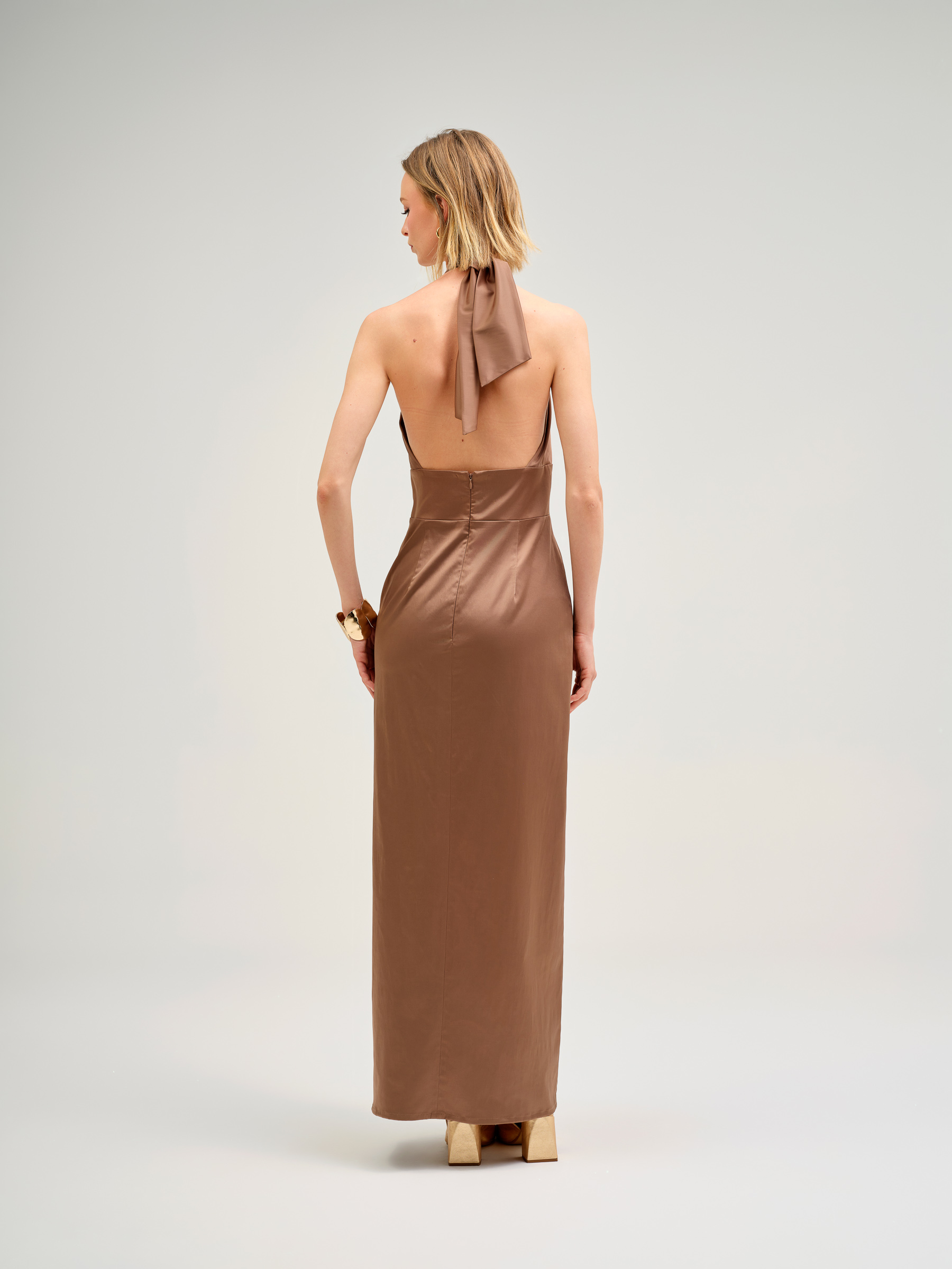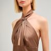Vestido Cristina Barros em cetim de brilho suave, com elegante decote halter torcido e costas descobertas.